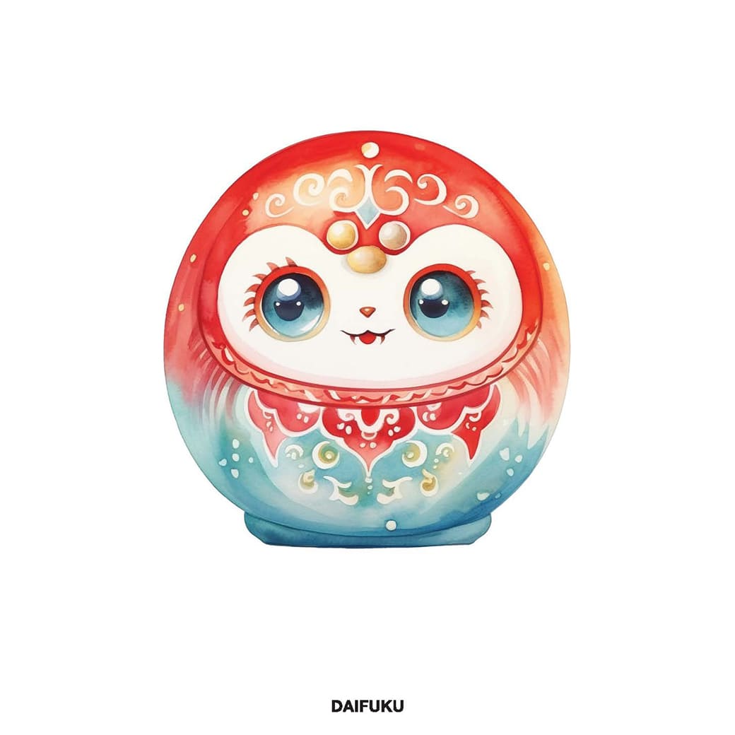 ดารูมะ (だるま) ตุ๊กตาล้มลุก เรามักคุ้นตา กับตุ๊กตาตัวกลมสีแดง มีหนวดเคราเข้ม ตาโต สัญลักษณ์แห่งความมีพลัง มีชีวิตชีวา และโชคดี เมื่อต้องทําโครงการอะไรให้สําเร็จ คนญี่ปุ่นจะอธิษฐานและวาดตาหนึ่งข้างให้ดารูมะ เมื่อทําได้สําเร็จตามประสงค์ตั้งใจแล้วก็จะมาวาดอีกข้างให้ครบสองข้าง อารมณ์ฟินิชฉุ ทําได้แล้ว เย้ๆ