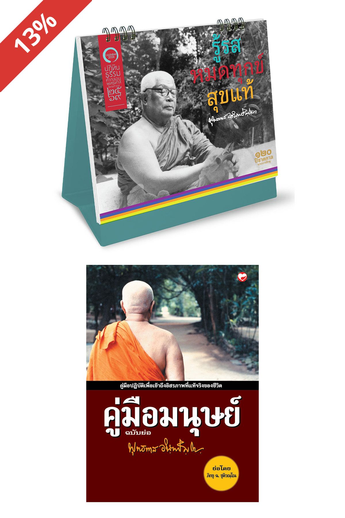 ปฏิทินตั้งโต๊ะด้านหนึ่งดูเดือนและวันที่ วันพระ วันสำคัญ อีกด้านชมภาพถ่ายคลาสสิคและอ่านข้อธรรมคำกลอน